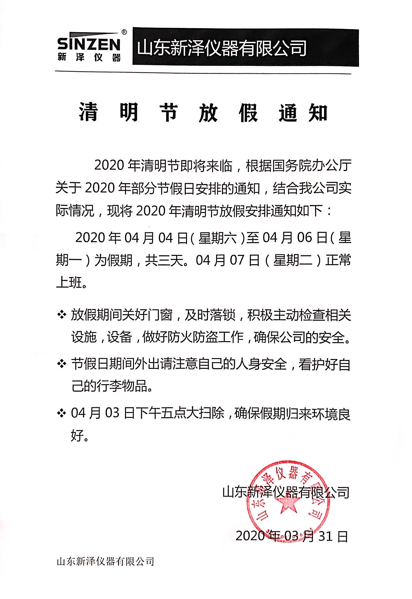 山東新澤儀器:清明節放假通知(04.04-04.06)