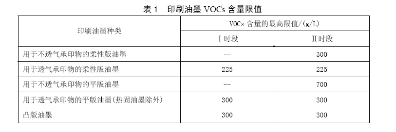 印刷企業(yè)生產(chǎn)過程中使用的印刷油墨VOCs含量限值(為處于即用狀態(tài)以每升油墨所含多少克VOCs計算)應(yīng)執(zhí)行表1的規(guī)定。