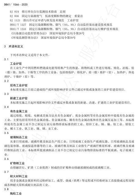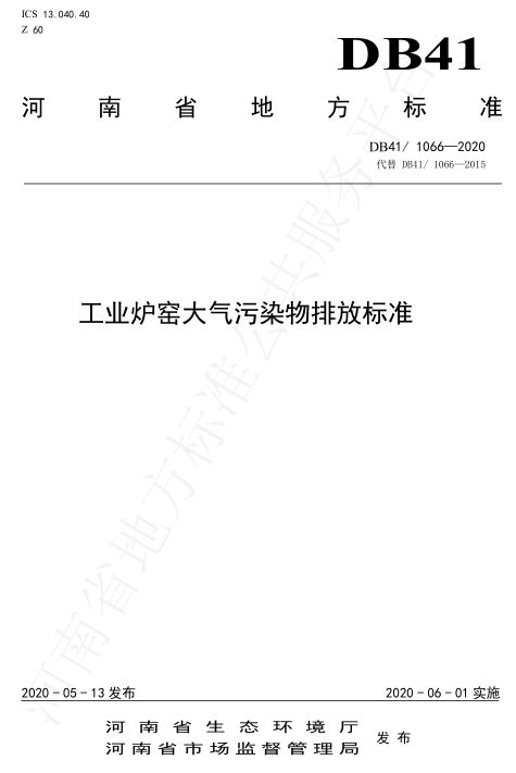 2020年4月10日,河南省市場監(jiān)督管理局、河南省生態(tài)環(huán)境廳在鄭州主持召開了地方標(biāo)準(zhǔn)審查會,對河南2015年發(fā)布的(DB41/1066-2015)進(jìn)行了修訂。2020年5月19日,河南省市場監(jiān)督管理局以2020年29號公告批準(zhǔn)發(fā)布了新修訂的《工業(yè)爐窯大氣污染物排放標(biāo)準(zhǔn)》(DB41/1066-2020),2020年6月1日起實施。